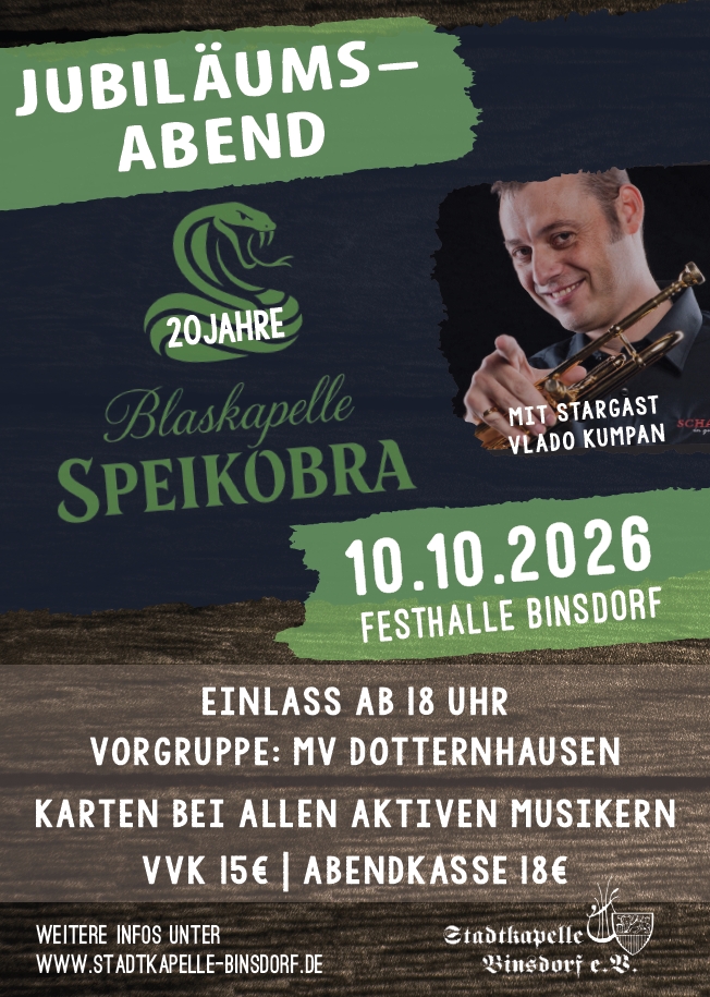 Samstag 10.10.2026: Jubiläumsabend 20 Jahre Blaskapelle Speikobra mit Stargast Vlado Kumpan